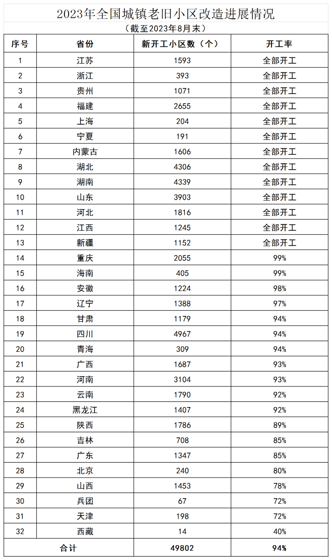 据了解,今年全国计划新开工改造城镇老旧小区5.3万个、涉及居民865万户。根据各地统计上报数据,1~8月,全国新开工改造城镇老旧小区4.98万个、惠及居民836万户,按小区数计开工率94%。分省份看,江苏、浙江、贵州、福建等13个省份全部开工。
