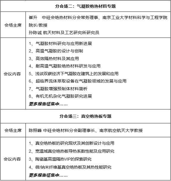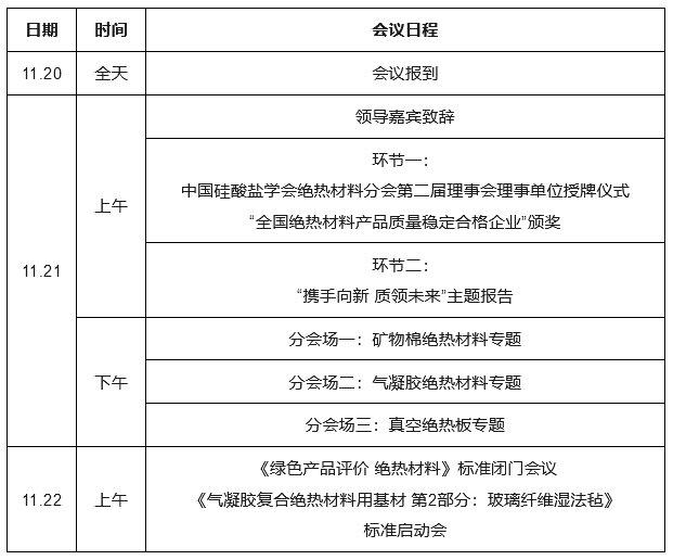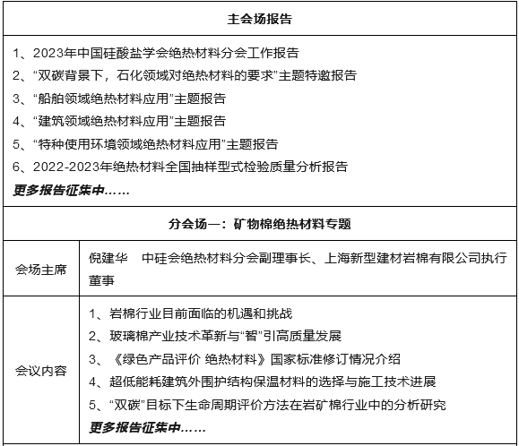 本届年会内容丰富,同期将进行:“中国硅酸盐学会绝热材料分会第二届理事单位”授牌仪式和“全国绝热材料产品质量稳定合格企业”颁奖仪式;“矿物棉绝热材料专题”“气凝胶绝热材料专题”“真空绝热板专题”分会场;《绿色产品评价 绝热材料》国家标准工作组闭门会议及《气凝胶复合绝热材料用基材 第2部分:玻璃纤维湿法毡》标准启动会;“绝热材料应用与产业发展成果展示会”。