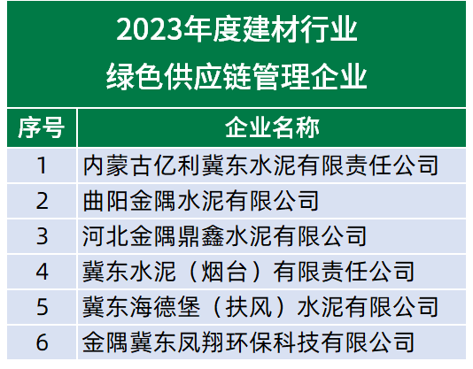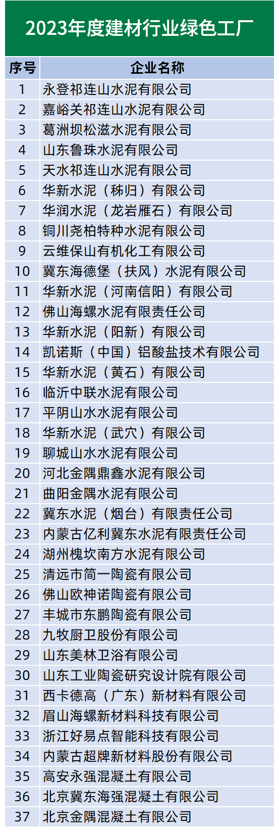 2023年11月30日,2023年度建材行业绿色制造标杆名单在2023年建筑材料行业大会上正式公布。共有43家单位荣获“2023年度建材行业绿色制造标杆”称号,其中建材行业绿色工厂37家、建材行业绿色供应链管理企业6家。