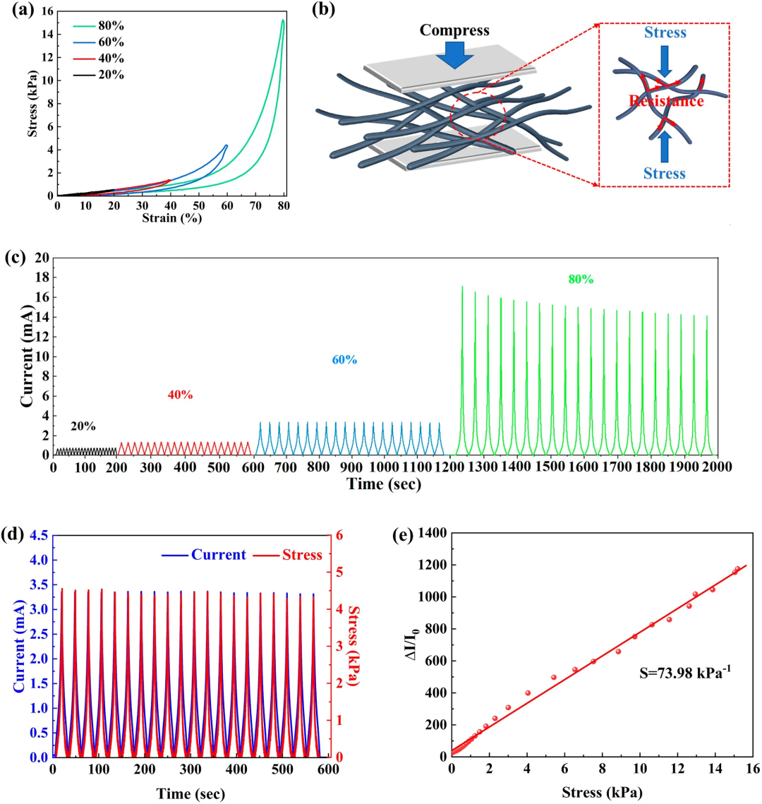 图4. (a) 应力-应变曲线;(b) MXene/C纳米纤维对外部应力的响应机理示意图;(c) 不同应变下的电流响应;(d) 电流在应力作用下的同步响应;(e) 线性灵敏度(工作压力范围0-15.19 kPa)。