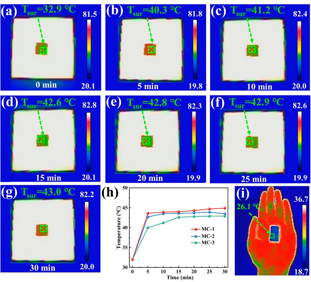 图7. (a-g) MC-3气凝胶在30 min内拍摄的热红外图像;(h) 放置在82℃加热板上的气凝胶表面温度变化曲线;(i) MC-3气凝胶放置在手上的热红外图像。