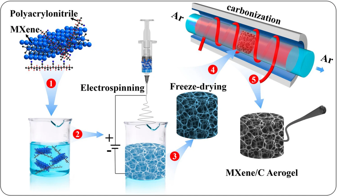 本文通过HCl-LiF刻蚀Ti₃AlC₂获得Ti₃C₂Tₓ MXene,并利用四丁基氢氧化铵(TBAOH)对MXene进行表面修饰以改善其在有机溶液中的分散性。将表面修饰后的MXene与聚丙烯腈(PAN)均匀分散在中N,N-二甲基甲酰胺(DMF)中,通过静电纺丝制备MXene/PAN纤维原丝并收集在去离子水中,随后冷冻干燥获得气凝胶。将MXene/PAN气凝胶在250℃氧气中预氧化1 h,然后700℃氩气中退火1h,获得MXene/C气凝胶。制备过程如图1所示。