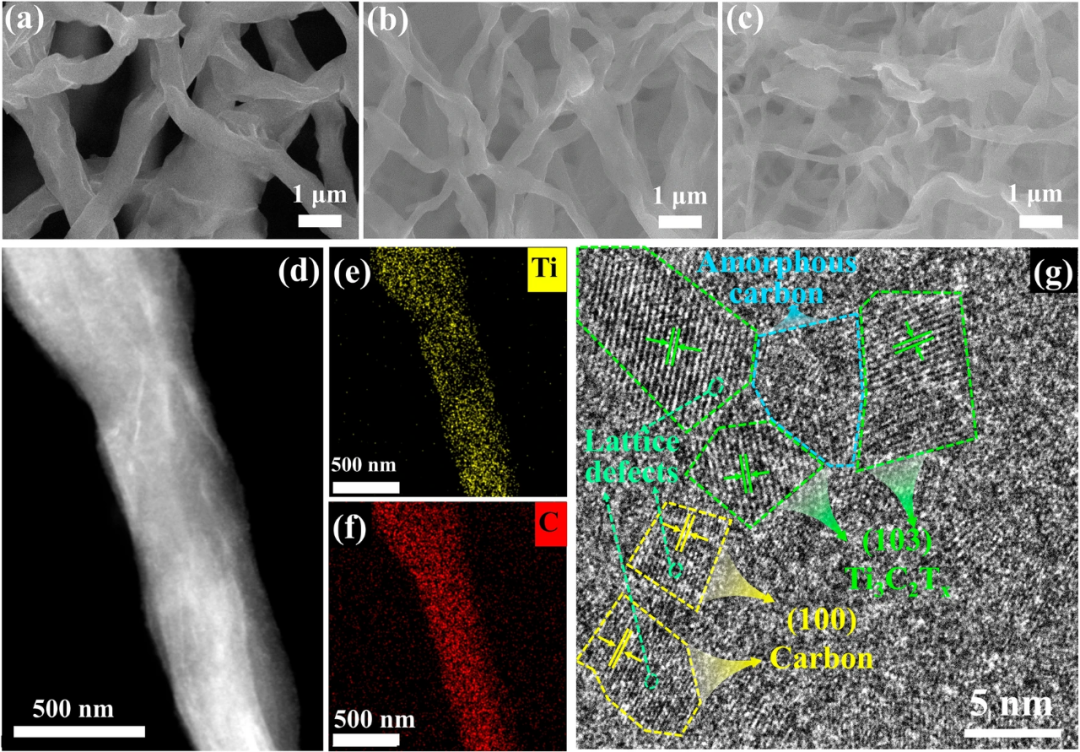 从图3(a-c)可以看出由于MXene纳米片在纺丝过程中发生卷曲,纤维表面产生明显的褶皱。此外,MXene/C纳米纤维的直径随着MXene含量的增加而减小,MC-3纤维的最小直径在100 nm左右。在HRTEM图像中(图3g),可以观察到宽度为0.24 nm和0.22 nm的清晰晶格条纹,分别对应于MXene (103)和carbon (100)平面。结合元素分布图(图3e和f),进一步表明MXene/C纳米纤维的主要成分是Ti₃C₂Tₓ MXene和碳。此外,纤维中存在着大量异质界面(晶体/非晶态界面)和晶格缺陷(如晶格畸变、不连续晶格条纹和点缺陷)。这些区域的晶格周期性被打乱,导致电荷分布不均匀和空间电荷区域改变,将有助于产生大量的界面极化和电磁损耗。