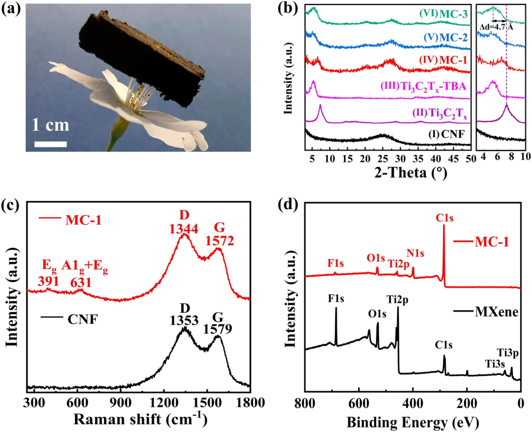 图2. (a) MXene/C气凝胶放置在樱花上的数字图像;(b) 样品的XRD图谱及局部放大图像;(c) CNF和MC-1气凝胶的拉曼光谱图;(d) MXene和MC-1的XPS光谱。