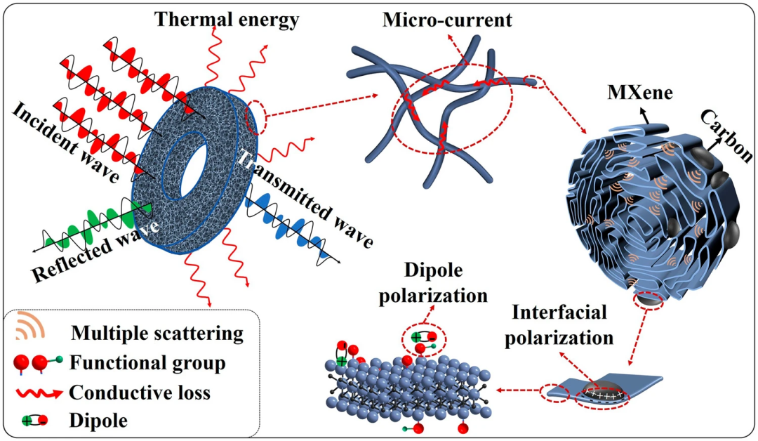 以5G通讯为代表的新型无线通信技术,推动社会进步的同时,也加剧了电磁污染。为此,开发具备“薄、轻、宽、强”特性的高性能微波吸收材料至关重要。在这一背景下,新型二维过渡金属碳化物/氮化物(MXene)材料凭借出色的导电性、高比表面积以及丰富的官能团等优势,成为一种极具潜力的微波吸收材料。然而,如何解决MXene材料存在的阻抗不匹配、易堆叠和高密度等问题,成为当前亟待解决的重要问题。