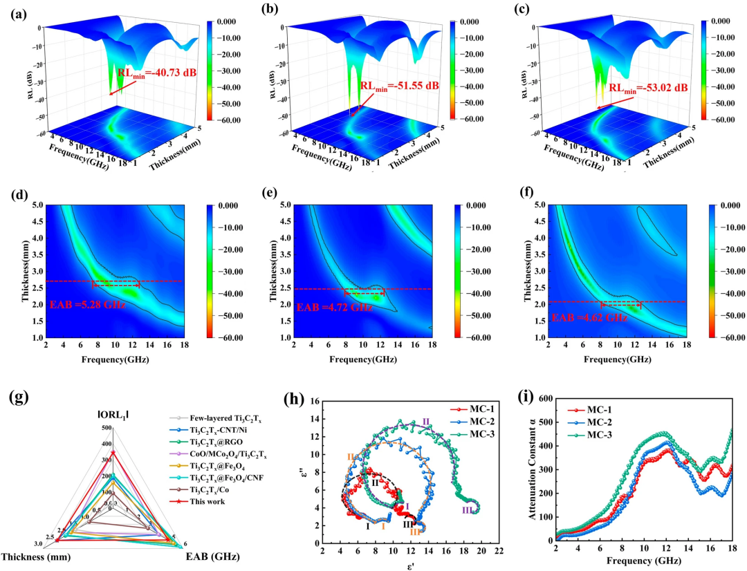 图5. MXene/C气凝胶的三维反射损耗图:(a) MC-1,(b) MC-2和 (c) MC-3;MXene/C气凝胶的二维带宽图:(d) MC-1,(e) MC-2和 (f) MC-3;(g) 典型MXene基吸波材料的微波吸收性能对比;MXene/C气凝胶的 (h) Cole-Cole圆和 (i)衰减常数。