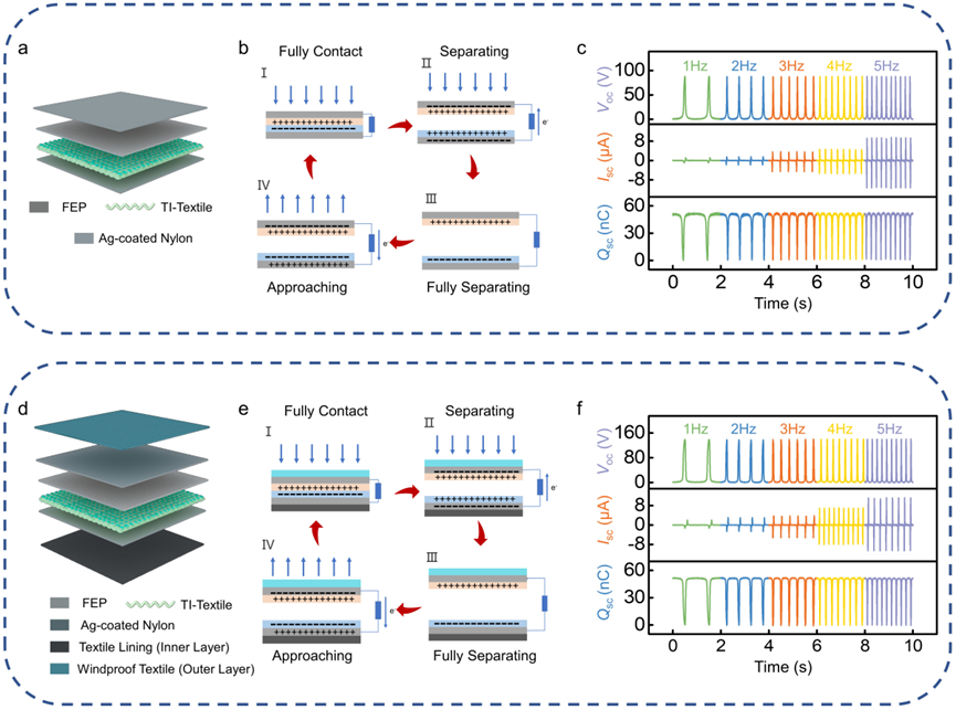 图2. TI-TENG的工作原理和输出性能。多层TENG结构示意图:(a)基本的TI-TENG结构;(d)用防风/防水/防雪织物和织物内衬包覆的TI-TENG。多层垂直接触分离方式的工作原理示意图:(b) TI-TENG的基本结构;(e) TI-TENG包覆在防风/防水/防雪织物和织物内衬里。(c)不同接触频率(1 ~ 5 Hz)下,基本结构TI-TENG和防风/防水/防雪织物和织物内衬TI-TENG的ISC、VOC和QSC。