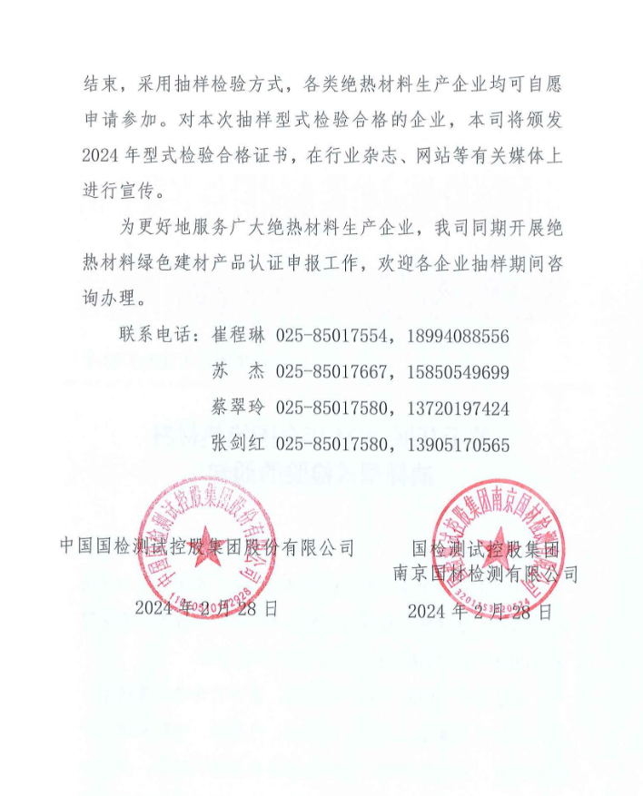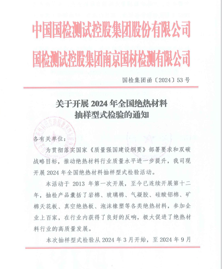 国检集团南京国材于2024年2月28日发布《关于开展2024年全国绝热材料抽样型式检验的通知》,原文如下: