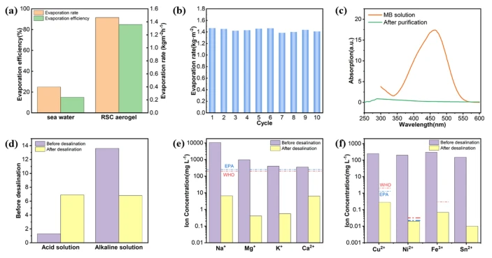 a)纯海水和RSC-a蒸发器的蒸发速率和蒸发效率的比较。b)RSC-A蒸发器的循环稳定性试验。c)染料废水净化前后的吸光度曲线。d)酸溶液和碱溶液纯化前后的pH值。e)模拟海水净化前后盐离子含量的变化。f)重金属废水净化前后各离子含量的变化。