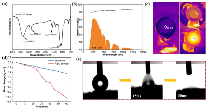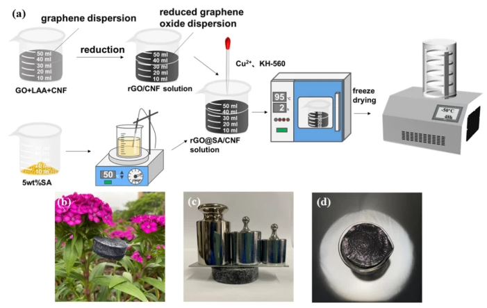 太阳能驱动的界面蒸发是一种可持续发展的绿色海水淡化方法,在当今水资源严重短缺的情况下具有广阔的发展前景。本文,东华大学俞丹副教授、王炜教授团队在《J Mater Sci》期刊发表名为“Preparation of rGO @SA/CNF-doped copper composite aerogels and their solar-driven interfacial evaporation properties in water purification”的论文,研究以还原氧化石墨烯为光热材料,以纳米纤维素为基底,在制备过程中加入海藻酸钠(SA)和Cu2+,采用水热法制备了一种新型复合气凝胶。