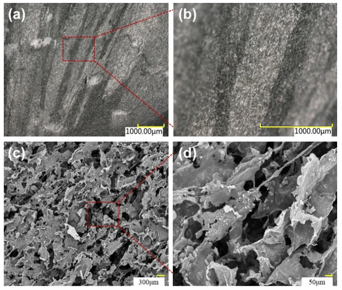 a、b) RSC气凝胶横截面的光学显微镜图像。c、d)RSC气凝胶底部的扫描电镜图像。