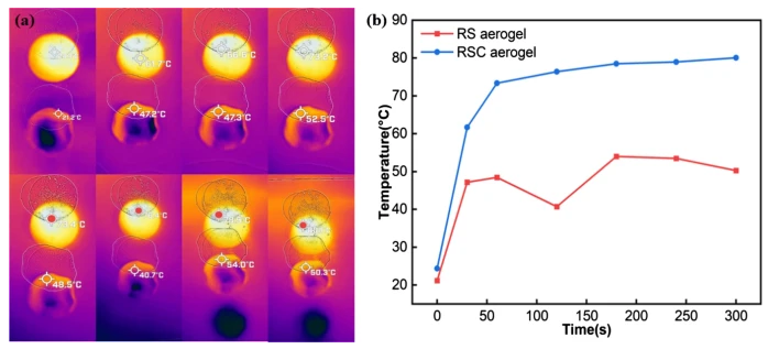a)红外热像仪在标准大太阳光照射下绘制RS-A和RSC-A的图。b) RS-A和RSC-A在标准大太阳光照射下的温度变化曲线。