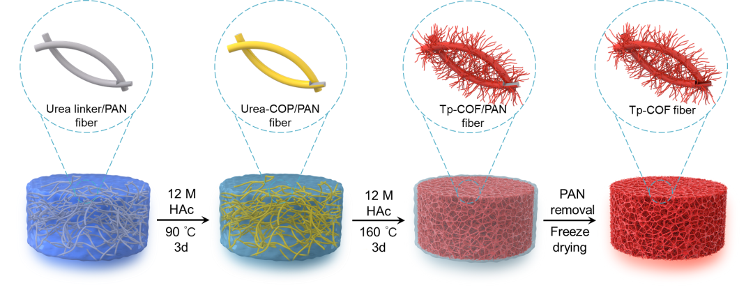 共价有机框架(COF)因其具有多样的结构和功能、永久的孔隙率和高比表面积,已被广泛应用与储能、催化、分离和环境修复等领域。然而,COF在实际应用中却面临着极大的阻碍:一方面,COF自身的微孔或小介孔不利于扩散和传质,从而抑制了它们的性能;另一方面,COF通常以难加工的纳米或微米级粉末形式存在,其繁琐的分离程序、难以回收和不可避免的损失极大地阻碍了其实际应用。因此,制备具有等级孔结构和优异机械性能的COF宏观材料是十分有意义的。