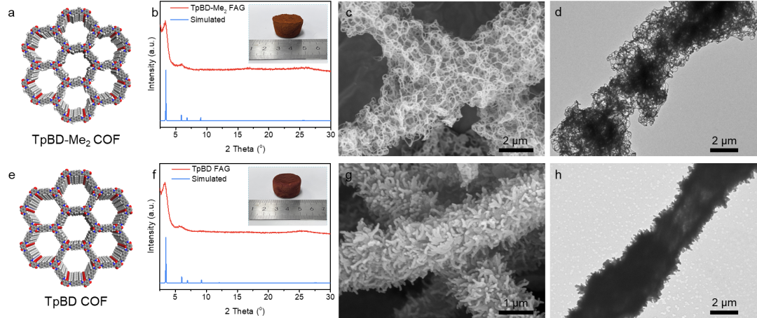 利用EGSA策略成功制备了TpBD-Me2 FAG和TpBD FAG两种COFs纤维气凝胶,为证明了该策略具有普适性(图3)。