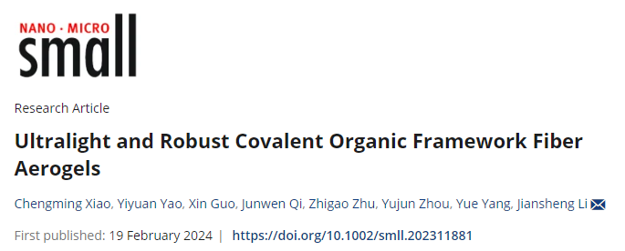 近日,南京理工大学李健生教授团队在期刊《Small》上,发表了最新研究成果“Ultralight and Robust Covalent Organic Framework Fiber Aerogels”。研究者报道了一种“外延生长协同组装”(EGSA)策略,用于制备超轻且稳固的纯COF纤维气凝胶(FAGs)。该研究采用静电纺丝工艺将脲基COF配体预包埋于微米级PAN纤维中,然后通过程序升温使大量纳米级COF纤维在PAN纤维表面原位生长并诱导其组装形成结构稳固的COF/PAN凝胶,最后将PAN模板去除得到由表面长有大量纳米级COF纤维的中空微米级COF纤维交联、缠绕而成的纯COF纤维气凝胶(图1)。此外,所制备的一系列具有等级孔结构的COF FAGs也是迄今为止密度最低(14.1-15.5 mg cm-3)、机械性能最好且有机溶剂吸附容量最大(CHCl3吸附量>90 g g-1)的纯COFs气凝胶。