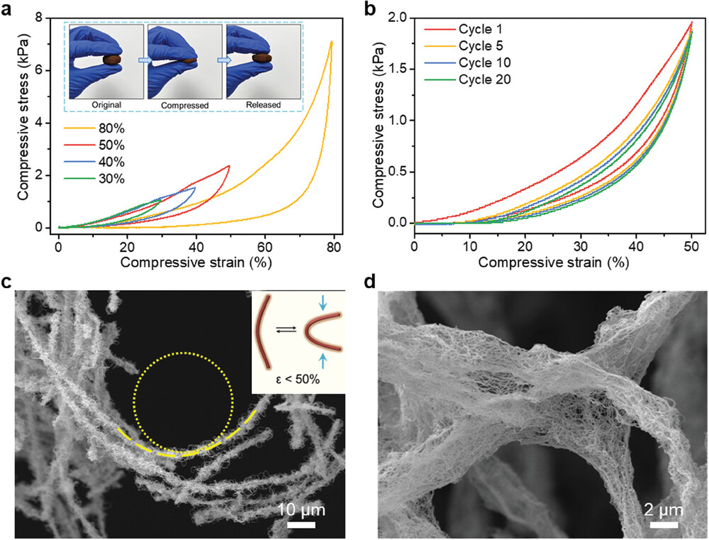 如图4a所示,TpPa-1 FAG即使被完全压缩也能恢复一定的高度,并且结构不发生坍塌。具体来说,它能够在低于50%的压缩应变下完全恢复。即使应变达到80%,恢复也能达到原始高度的94%。此外,TpPa-1 FAG可以在50%应变下重复压缩20个循环,应力退化小于7%,样品的高度几乎保持不变(图4b)。具有如此优异机械性能的纯COF气凝胶在此前的工作中并未被报道过。TpPa-1 FAG优异的机械性能归功于其独特的纳米纤维和中空微纤维的交织结构。在微米尺度下,单个中空COF纤维可以承受曲率半径小于35µm的大弯曲形变而不断裂(图4c)。此外,原位生长的纳米纤维能够协同交联微米纤维,从而提高纤维骨架的稳定性和强度(图4d)。
