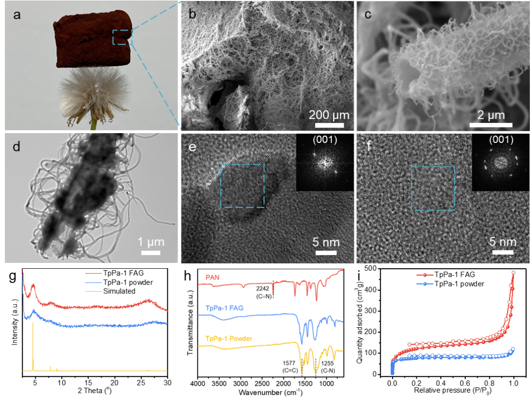 以TpPa-1 FAG为例,其密度约14.1 mg cm-3,低于所有已报道的纯COF气凝胶(图2a)。从SEM图中可以看出TpPa-1 FAG由中空微米级COF纤维交联缠绕组成,在其表面生长有大量的纳米级COF纤维(图2b-c)。TEM及选区电子衍射结果确认了微米与纳米COF纤维的结晶度(图2d-f)。XRD与FT-IR结果进一步表明PAN的完全去除以及TpPa-1 COF的成功制备(图2g-h)。通过氮气吸附-脱附等温线可以看出,与TpPa-1粉末相比,TpPa-1 FAG具有更大的表面积以及大量的介孔和大孔,表明等级孔结构的成功引入。