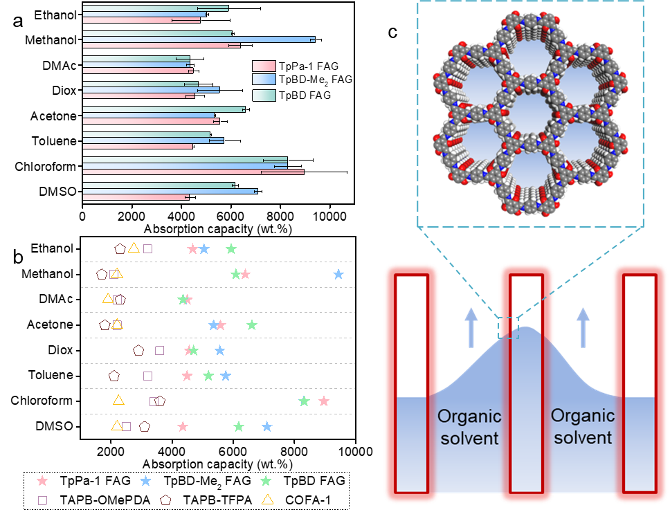 图5:三种COFs FAGs的有机溶剂吸附性能。