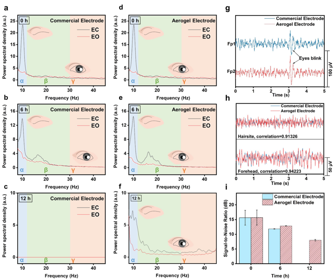 图4. 使用商业电极与柔性气凝胶电极进行睁闭眼脑电信号采集