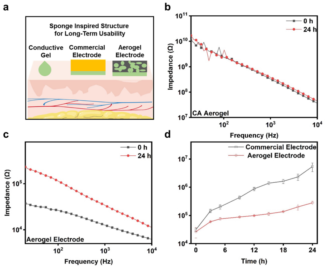 图2. 柔性气凝胶电极及商业电极在长期使用中接触阻抗分析