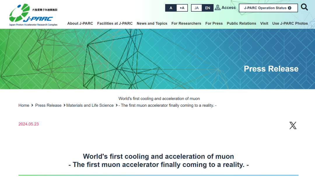 2024年5月23日,日本大强度质子加速器(J-PARC)研究中心发布消息称其成功实现了μ子的“冷却”和加速,属全球首次!