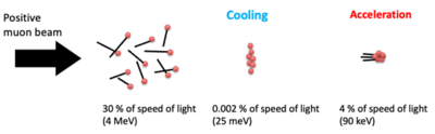 在J-PARC中,用质子加速器产生的速度约为光速30%的正μ子被射入一种称为二氧化硅气凝胶的材料中,正μ子与二氧化硅气凝胶中的电子结合,形成称为μ子素的中性原子。通过用激光照射μ子素来剥离电子,我们获得了正μ子,这些正μ子已经被减慢(冷却)到几乎停止的速度,大约是光速的0.002%。之后,施加射频电场以加速正μ子。由于正μ介子几乎是静止的,它加速得越多,方向性就越强,从而产生了可用于各种应用的方向性更强的μ子束。