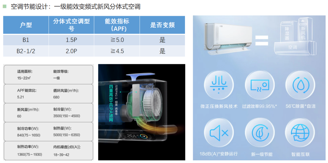 空调节能方面,采用带新风功能一级能效变频式分体空调,在满足30m³/人·h新风标准的前提下,采用高能效空调,降低空调运行能耗。