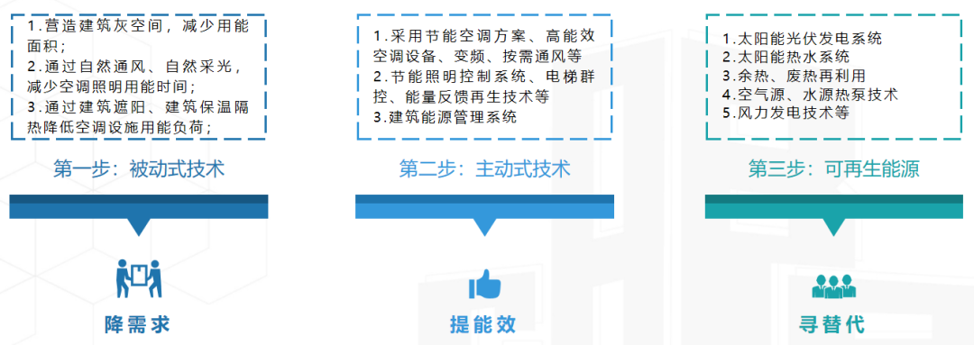 项目遵循“被动优先,主动结合,应用可再生能源”的节能设计理念,通过被动式策略降低用能时间和用能负荷需求,通过主动式策略,提高能源使用效率,降低单位用能负荷能源消耗水平;应用可再生能源替代传统能源,进一步减少项目电力能源消耗。