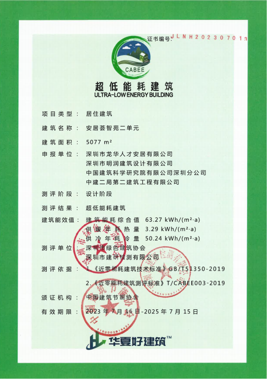 项目因地制宜运用主被动节能策略,采用太阳能光伏发电系统,达到超低能耗设计目标。项目于2023年7月获得中国建筑节能协会颁发的超低能耗建筑设计标识,于2023年获评深圳市第二批超低能耗、(近)零能耗及零碳建筑试点项目。