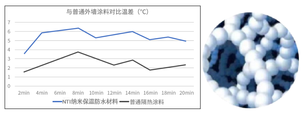 据悉,NTI纳米保温防水材料融合气凝胶及改性聚氨酯技术,具有超强防水特性及极低的导热系数、适用性广、附着力强等特点。涂层整体厚度不超过2mm,即可达到普通外墙保温5~6cm的相同保温效果,并且常温热导率为传统隔热材料的1/3~1/5,达到很好的隔热保温效果的同时具备良好的防水特性。其耐候性能远远超过常规的防水材料,具备20年以上寿命。此外,NTI纳米保温防水材料具有良好的施工性能,具备瞬间快速固化的特性。对施工周期短、耐候性强等高要求的环境尤其具备优势,施工结束后2小时内就能投入使用。