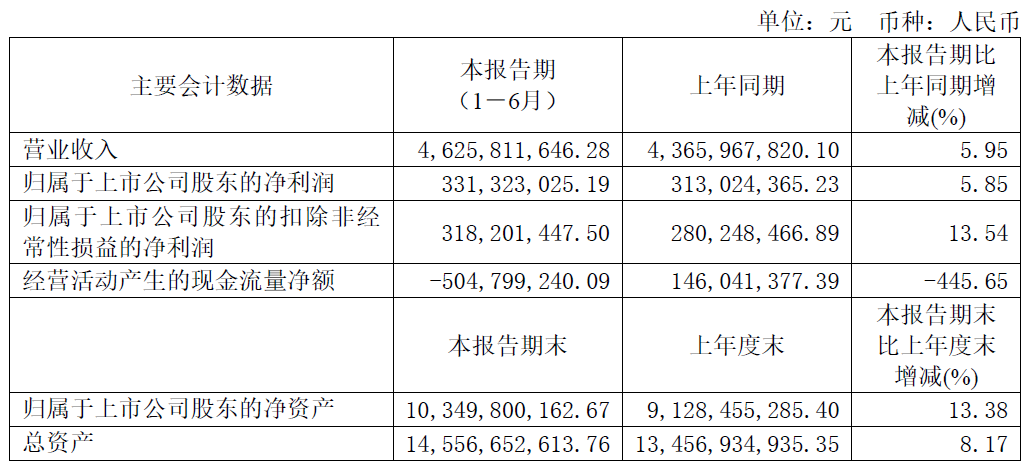 2024年8月24日,圣泉集团披露2024年半年报,上半年实现营收46.26亿元,同比增长5.95%;归母净利润3.31亿元,同比增长5.85%,毛利率23.16%,同比上升1.10%。