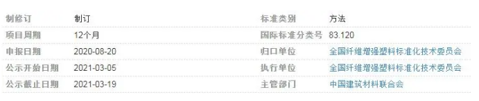 2021年3月5日,国家标准委在全国标准信息公共服务平台发布公告,决定对《玻璃纤维增强塑料制品 纤维长度的测定》等139项拟立项推荐性国家标准项目公开征求意见,截止时间为2021年3月19日。国家标准计划《玻璃纤维增强塑料制品 纤维长度的测定》由 TC39(全国纤维增强塑料标准化技术委员会)归口上报及执行 ,主管部门为...