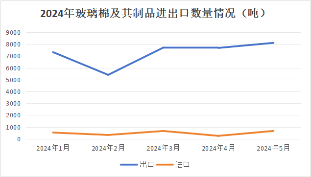 2024年5月,玻璃棉及其制品进口数量为666.3吨,同比下降19%,环比增加168%;进口金额为2968.35万元,同比增加7%,环比增加82%;进口均价同比增长32%,环比降低32%。